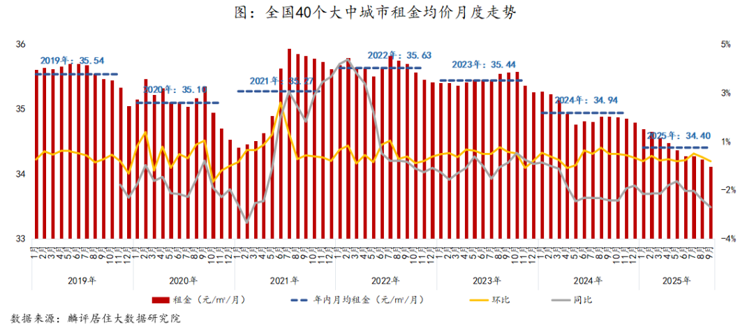举座来看,前9月份世界40个大中城市房钱挂牌均价为34.4元/㎡/月,较2024年房钱水平下降1.53%,同比流畅23个月下降,2025年以来住房房钱创2019年以来新低。